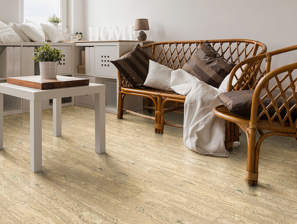 Клеевой вариант – это плитки из массива прессованной пробки и верхний натуральный шпон коры. Плитки приклеиваются к основанию и покрывается специальным лаком, как паркет. Главное достоинство – водостойкость, широкая область применения в интерьере. Хороший вариант для использования как в комнатах, так и на кухне или ванной.